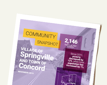 In the Town of Concord and Village of Springville, poverty is on the decline and the total population is growing slightly. Despite low crime and improving graduation rates, many children, single parents, and young adults live in poverty. Strategies to promote local economic growth, workforce training, and transportation options could enhance access to higher-paying jobs and other opportunities for community residents.